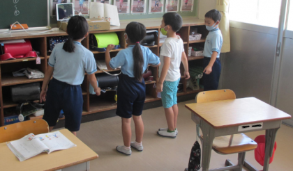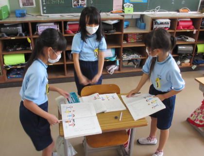 「空に ぐうんと 手を のばせば」を読むと、動きや読み方などさまざまなイメージがわいてくるとても楽しい詩です。詩の意味をじっくり考え、この詩を音読するのにどのようにしたらよいのか、話し合いました。話し合ったことをもとに、グループで相談しながら練習を進めています。発表が待ち遠しい様子です。