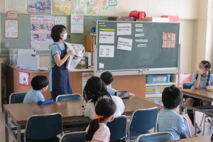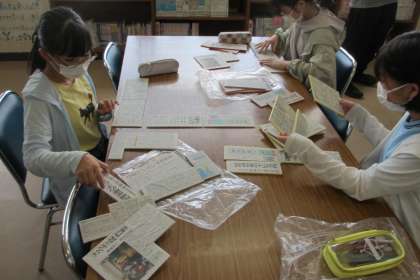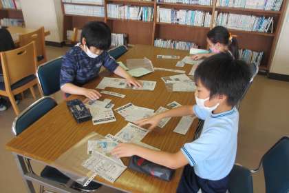 新聞記事について、図書館司書の先生から教えていただきました。新聞のことについて、新聞を読み慣れていない子どもたちにとって知らないことばかりでした。新聞の構成を知るために、新聞の第1面を並べるパズルをしました。ばらばらになっているものを正しく並べてみました。
