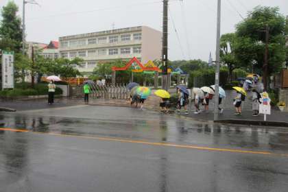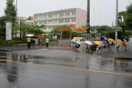 雨の中、PTA役員の方にあいさつ運動を行っていただきました。新型コロナウィルス感染対策として、大きな声でのあいさつを控えています。その代わりに、子どもたちは、元気よく手を振ったり、にっこりと笑顔であいさつをしたりしてくれます。