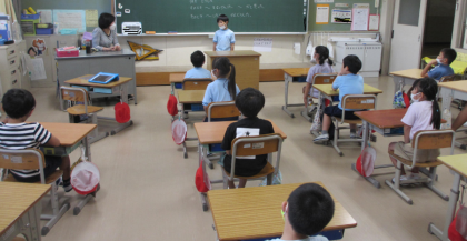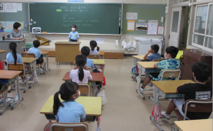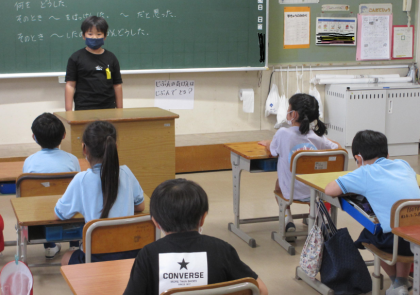 「2年生の夏休みを話そう」という目標で、夏休みの出来事で心に残ったことをスピーチしました。「いつ どこで 何を どうした」のかはっきりさせて、聞く人がよくわかるように考えて話しました。2年生の子たちは、とてもしっかり話すことができました。どの子も進んで話したことや、みんなが真剣に聞いていたこともすばらしかったです。