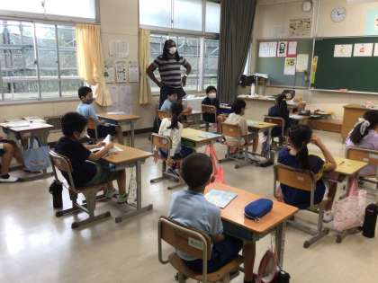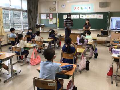 今日は、6年生、3年生、4年生がクリントン先生と一緒に、外国語の勉強をしました。アメリカでは、土曜日の朝はアニメが見放題ということです。おもしろいですね。
