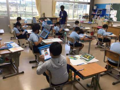 3年生、国語科の授業で、「サーカスのライオン」の学習をしています。分からない言葉を学習用タブレットで調べていました。