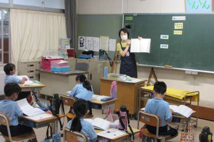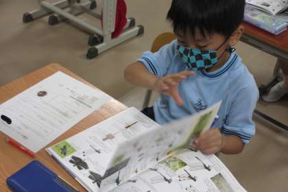 長放課になると、1年生は運動場の昆虫を夢中で探しています。そのような1年生に、昆虫図鑑の使い方を司書教諭の先生から教えていただきました。さっそく図鑑を使って、見つけた昆虫を調べることができました。