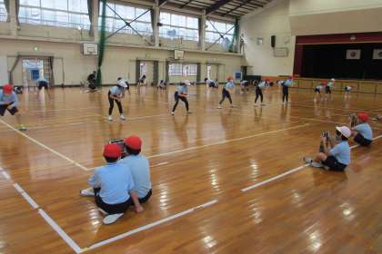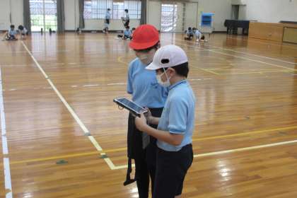 タブレットで自分たちの動きを録画したものを見て確かめながら練習をしています。お互いにアドバイスをし合うことで、だんだんと動きがよくなっています。練習を見るたびに、子どもたちの成長を感じます。真剣に練習に取り組んでいます。