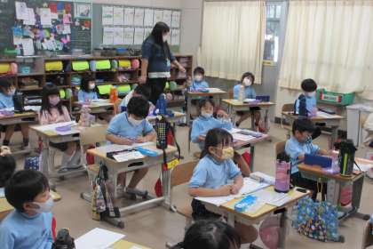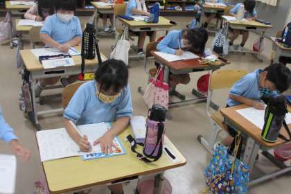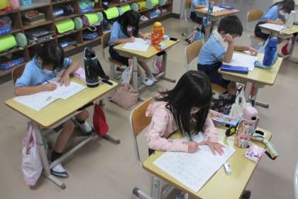 算数の時間は、計算問題に真剣に取り組みました。できた人は、先生に確認してもらいました。間違いがあったら、すぐにやり直して、もう一度先生に確認してもらいました。国語の時間は、漢字の練習を一生懸命に取り組みました。真面目に授業を行う1年生、とてもすばらしいです。