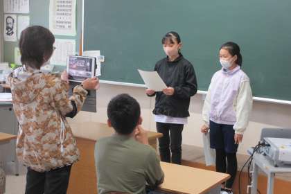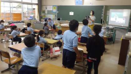 グループで集まっての縦割り遊びの代わりに、リモート配信で行うことを始めました。今日は、6年生の教室から「ジェスチャーゲーム」を各学年に配信しました。6年生は、縦割りグループごとに1問ずつ出題しました。各学年の教室では、同じ縦割りグループの子が答えました。