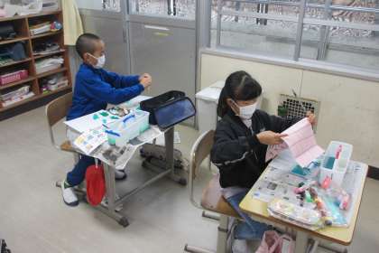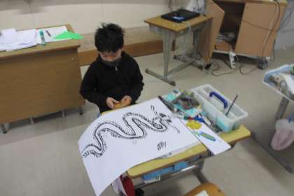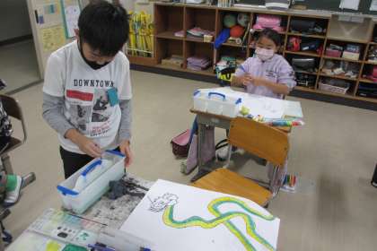 4年生は、「龍」のお話で読書感想画を描きます。それぞれの子がイメージした龍を描こうと真剣です。龍の姿・形だけでなく、色やぬり方を何度も試しながら工夫しています。だんだんと龍の姿が決まってきました。どのような龍が完成するのか楽しみです。