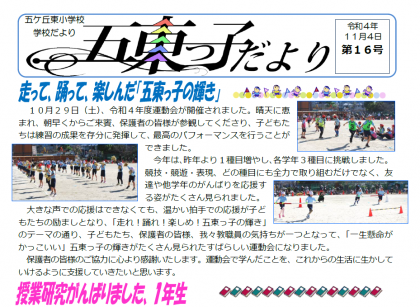 学校だより 学年通信 11/4発行 公開日 2022/11/04 更新日 2022/11/04 お知らせ 「五東っ子だより16」をアップしました。 ↓ 五東っ子だより 16 最新の学年通信はこちらです。 ↓ 1年 2年 4年 5年 6年