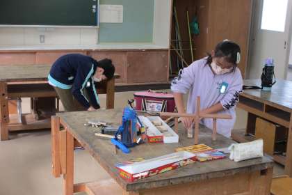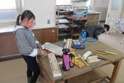 のこぎりやきり、かなづち、釘抜きなどの道具を使って作っています。のこぎりや釘抜きの使い方がぎこちないですが、少しずつうまくできるようになってきています。自分がイメージした作品になるように、いろいろと試しながら進めています。