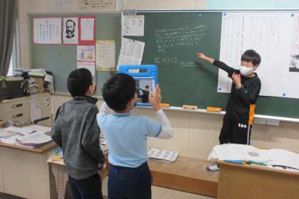 ICT支援員の方に来ていただき、タブレットに入っているソフトの使い方を教えていただきました。3・4年生では、動画の作り方を学びました。協力し合って撮影した画像を編集して動画にしました。お互いに演技をしながら写真を撮っている様子がとても楽しそうでした。写真だけでなく、文字を入れて動画を作成することができました。