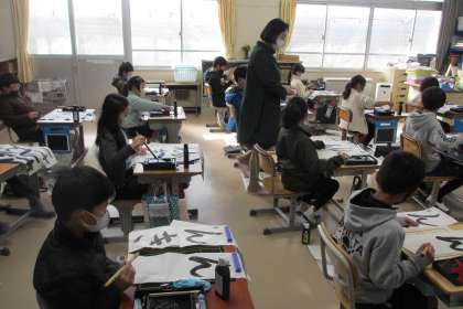 書き初め指導に講師の先生に来ていただきました。3年生から6年生に毛筆の指導をしていただきました。水晶板に字を書いて、お手本を示しながら、字の書き方のポイントや筆つかいをていねいに教えていただきました。来週の金曜日にも来ていただきます。