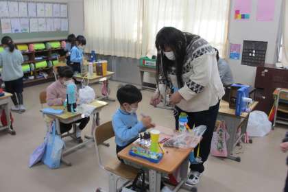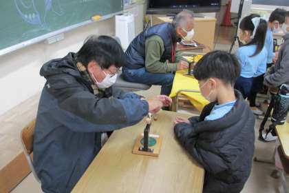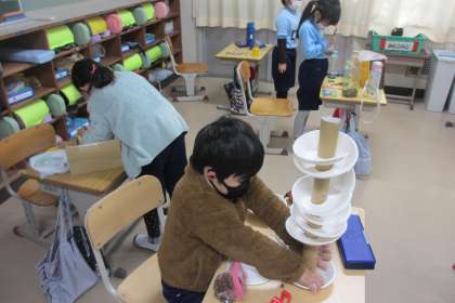どんぐりを使っておもちゃを作りました。どんぐりの穴あけや、おもちゃ作りを地域学校共働本部にお願いしたボランティアの方に手伝っていただきました。子どもたちは、自分が考えたおもちゃをどんどんと作っていきました。授業の後半では、完成したおもちゃを使って、ボランティアの方をまじえて、交代で遊びました。