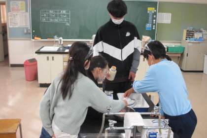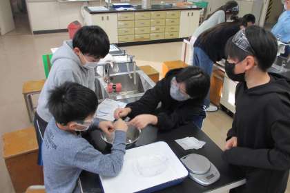 ミョウバンと食塩を使って水への溶け方を調べました。今日の授業では、水の温度を上げると溶ける量が変わるのか実験して確かめました。