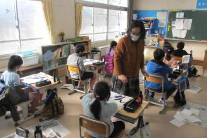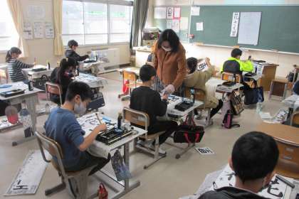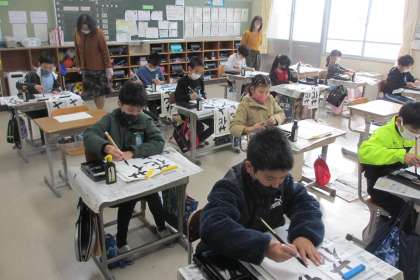先週に引き続いて、書き初め指導に講師の先生に来ていただきました。先生は、一人一人の字を見て、アドバイスしていただきました。先生のアドバイスを忘れずに練習していきましょう。