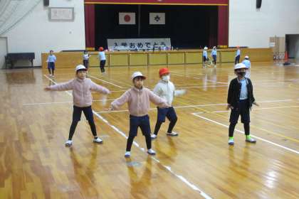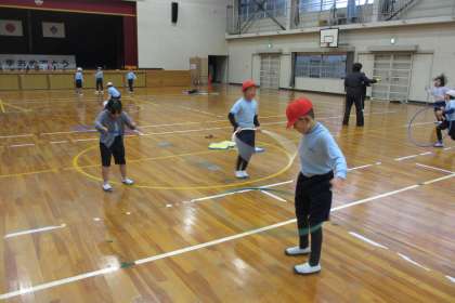 グループに分かれて、縄跳び、フラフープ、ダンスなどを行いました。技に挑戦したり、そろえて踊ったりと目標を決めて練習しました。楽しみながら、体を動かしていることがとてもよいなと思いました。
