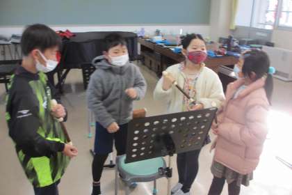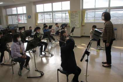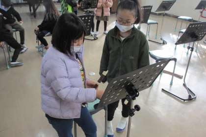 リコーダーで「パフ」の演奏を練習しています。みんなで演奏練習をしたあとで、グループに分かれて演奏できているところと、もう少し気を付けたほうがよいところを話し合いました。話し合いで出た意見を学級全員に伝えた後、再び演奏練習をしてよりよいものにしていきました。