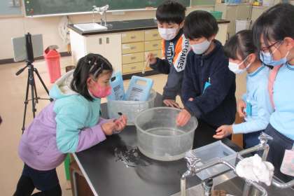 「空気の温度が変わると空気の体積はどうなるのか」実験して調べました。試験管の中の空気をあたためたり、ひやしたりしたときの変化を確かめました。試験管の口のところに石鹸水のまくをはり、空気の体積の変化を見ました。