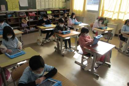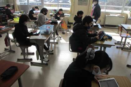 訓練後は、教室に戻り、タブレットを使って訓練の振り返りをしました。