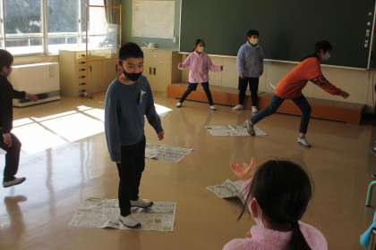 縦割り遊びをしました。グループごとに、爆弾ゲーム、新聞紙乗りゲーム、エスチャーゲーム、福笑いゲームなど6年生が準備した遊びをしました。