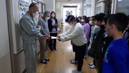 今年一年、子どもたちのために働いていただいた方にお礼の手紙を書き、感謝の気持ちを伝えています。今日は、4年生が全校を代表して校内整備員さんに手紙を渡しました。