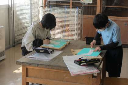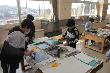 版画板に彫れた子から印刷をしました。試し刷りを何枚か行って、版画用紙に印刷しました。インクのつけ方や印刷するときの力の入れ方でインクの濃さを変えることができます。自分のイメージする版画になるようにあれこれと考えながら行いました。