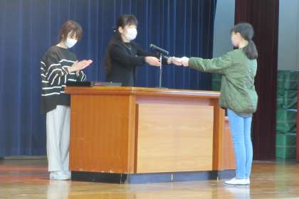 予行練習の後、6ケ年皆勤賞、いいとこメモっとこ賞、各種作品応募入選者の表彰を行いました。