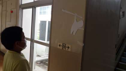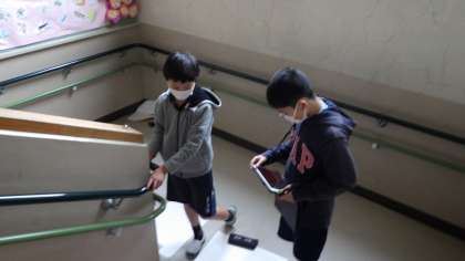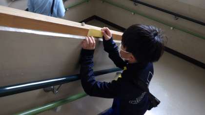 今回は、校舎の中全体を一つの展示場として、6年生が遠近法を生かした作品作りを行っています。本時は大まかな大きさを確かめるために試作品を作りました。5月中に完成し、展示します。お楽しみに。