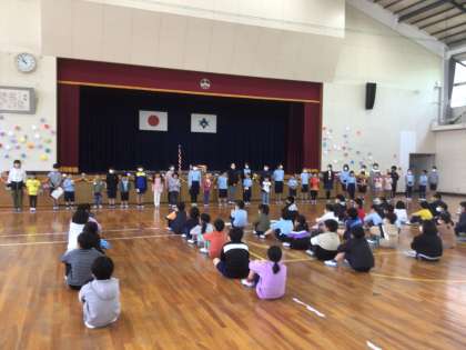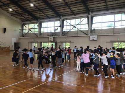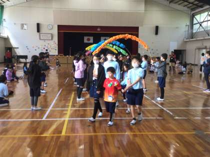 久しぶりに体育館に全校児童が集まっての行事です。6年生が考えてくれたゲームを縦割り班で楽しみました。最後はじゃんけん列車で、全員が1本の列車でつながりました。