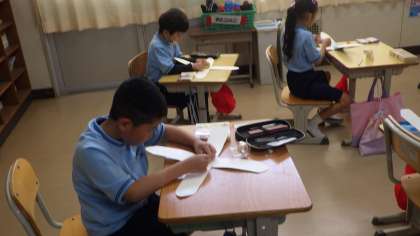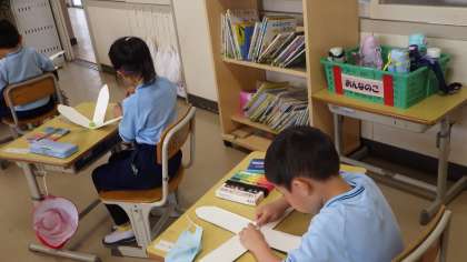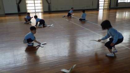 1年生の子たちが、図工で、牛乳パックを使って、ビッグこまを作りました。先生の説明をよく聞いて、上手に作りました。その後、体育館で、作ったこまを元気よく回して楽しんでいました。