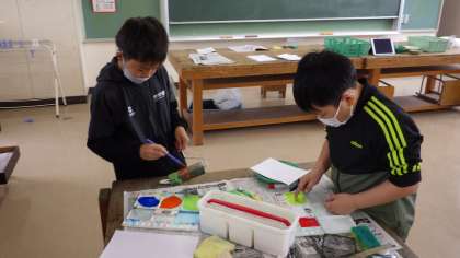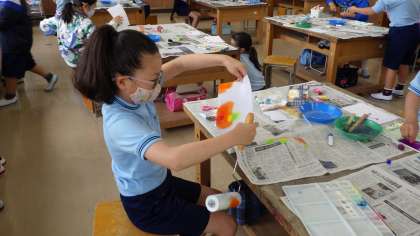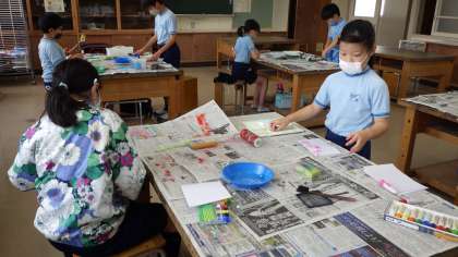 「絵の具でゆめもよう」の学習の様子です。筆を使わず、ローラーやビー玉、ブラシなどを作って様々な模様を作りました。友達にやり方を教えてもらったり、紹介したりする姿が見られ、活発な授業になりました。