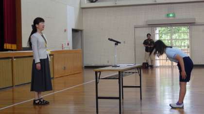 全校の元気な挨拶から集会が始まりました。校長先生が、気付き、考え、実行することの大切さについて話しました。
