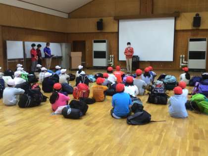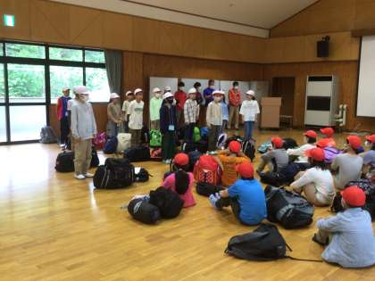 晴天に恵まれ、キャンプスタートです。自然の家で、入所式を行いました。五東小のみんなは校歌を披露しました。