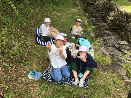 お弁当は探検ビンゴ中に、班ごとで食べます。運良く、巡り会えました。