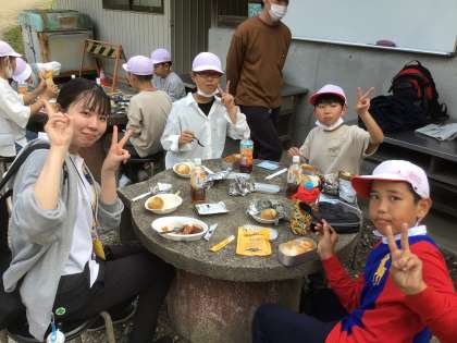 火起こし体験で、昔の人の大変さを実感しました。無事についた火で、じゃがいもを焼き、美味しく炊けたご飯に、カレーをかけて、美味しくいただきました。