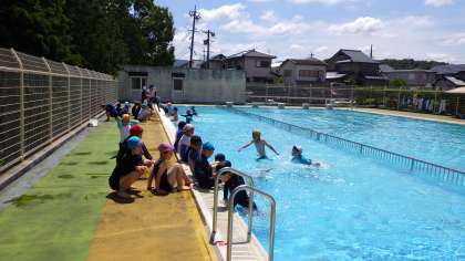 2,3時間目に3・4年が水泳の学習を行いました。水慣らしの活動を行い、最後は碁石拾いを楽しみました。