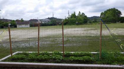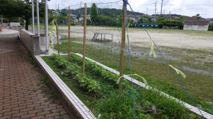 地域学校共働本部の方々が、花壇で1年生が育てている朝顔の苗のために、立派な支柱を設置していただきました。