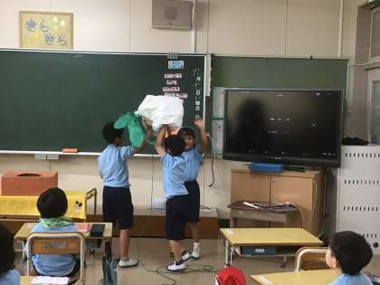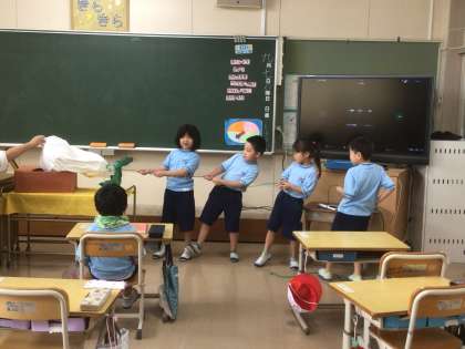 1年生は国語で、「大きなかぶ」の寸劇に挑戦していました。各班で工夫を凝らして、熱心に取り組んでいました。