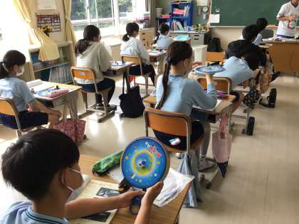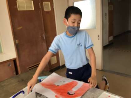 4年生は図工で新聞紙を細長く丸め、筒状にしたものを作品の材料としてたくさん作りました。友達と協力して教えあい、長く丈夫に作れるようになりました。5年生は読書感想画の制作です、習った技法を使いながら色をぬっていました。6年生は月と太陽の学習です。