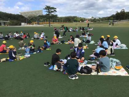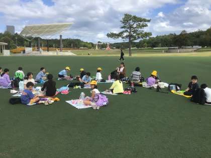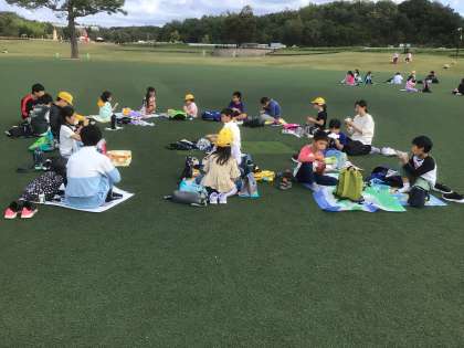 見学を終えて、秋晴れの下、芝生広場で美味しいお弁当タイムです。