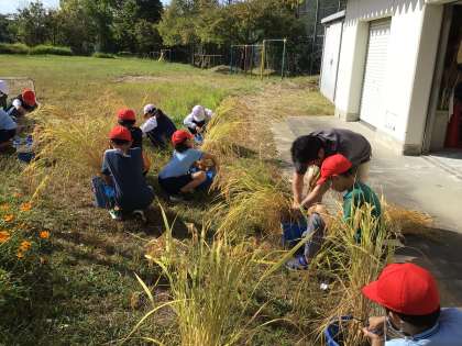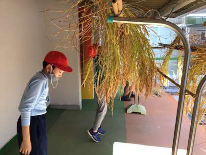 天候にも恵まれ、無事に収穫を終えました。収穫した稲は、乾燥させるために干しました。今後の学習が楽しみです。