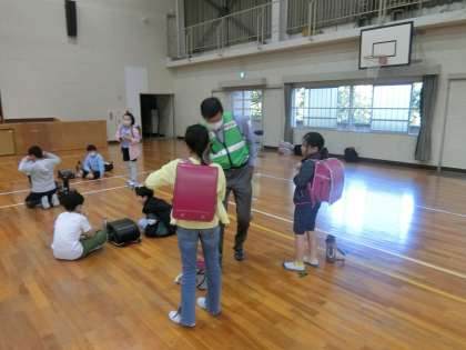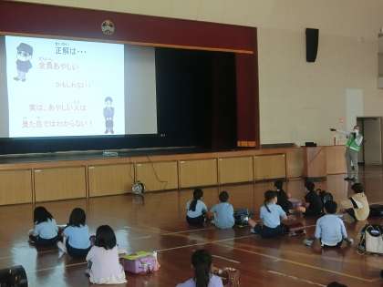防犯上気を付ける場所や、自分の身を守る方法、防犯ブザーの使い方について学習しました。子どもたちは説明をしっかりと聞くことができました。