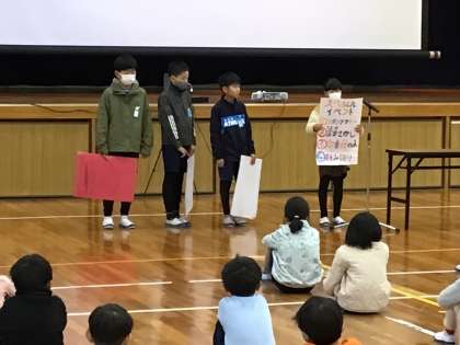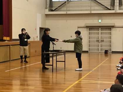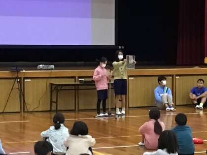 表彰、生活・放送委員による今月のめあての発表、図書委員会によるおいでん週間のお知らせがありました。