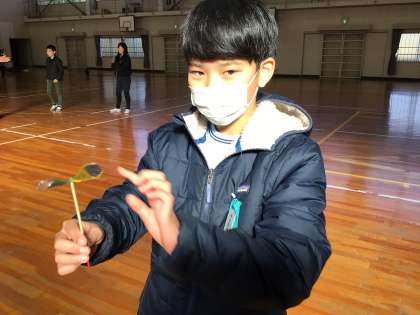 5年生が竹とんぼを作りました。竹とんぼ制作の前段階として、紙製、ブラスティック製のものも作り、飛ぶ原理について確かめました。