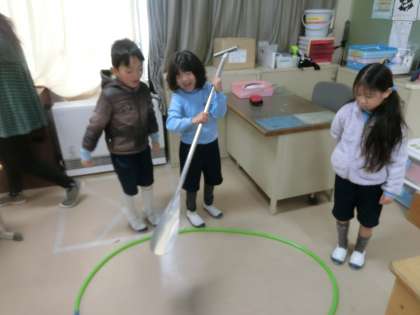 栄養教諭の方から給食がどのように作られるかについて学習しました。また、給食を作っている方々の思いについても考えました。給食センターで使われている鍋の直径と同じ大きさの円は、クラス全員の子と担任が入ってしまうほどの大きさであるとわかり、驚いていました。そして、センターで使っている大きなしゃもじを使わせていただき、混ぜる体験も行いました。