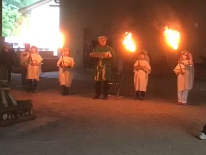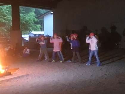 焼きそばの後は、夕べの集いに続いて、キャンプファイヤーです。第1部と第3部は厳かな雰囲気で、第2部は各班のスタンツで盛り上がりました。