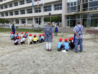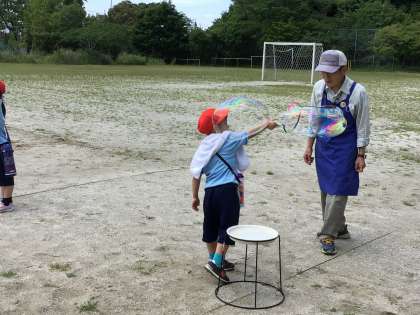 次に作った道具でシャボン玉を作りました。大きなシャボン玉を作ろうと先生方の話をよく聞き、慎重に動かしていました。大きなシャボン玉ができると歓声があがっていました。
