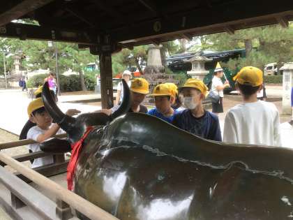 学問の神様と言われる菅原道真が祀られている北野天満宮。牛の頭を撫ぜて、頭が良くなるように、願掛けしました。