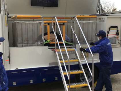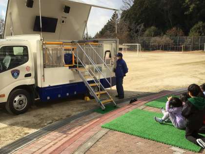 豊田消防署の地震体験車「防サイ君」で実際に震度6の状態を体験しました。