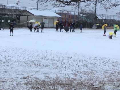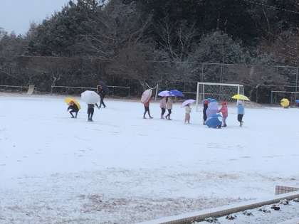 朝の準備を終えると、たくさんの子どもたちが校庭に出て、初雪を楽しんでいました。