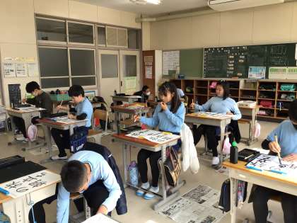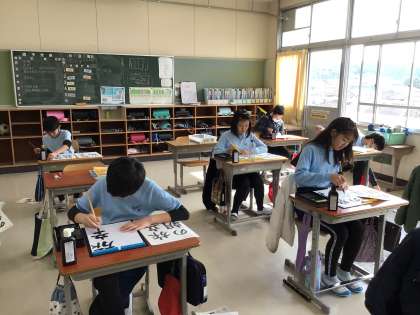 6年生が書写で、習字を行いました。 「旅立ちの朝」の作品に取り組んでいます。